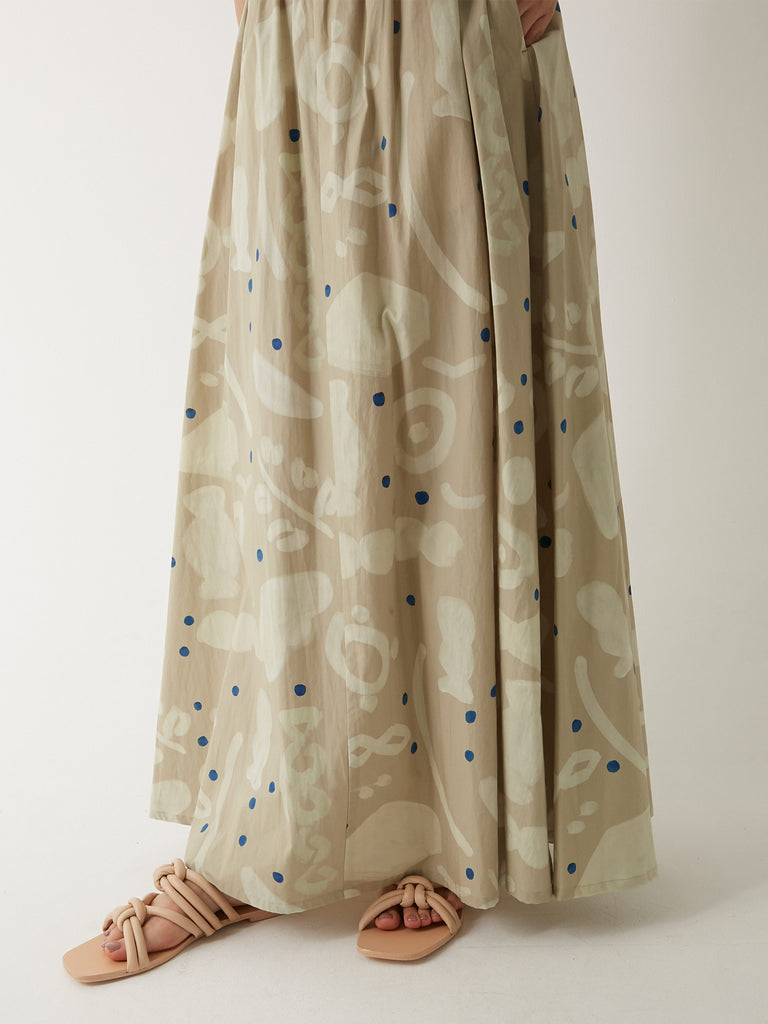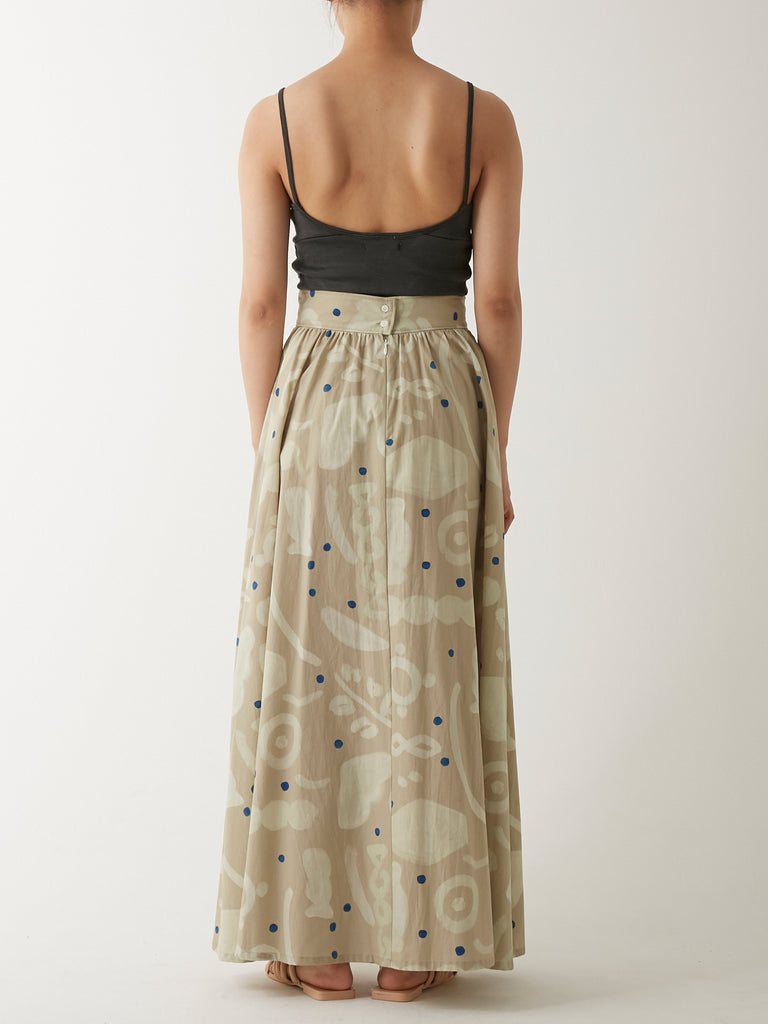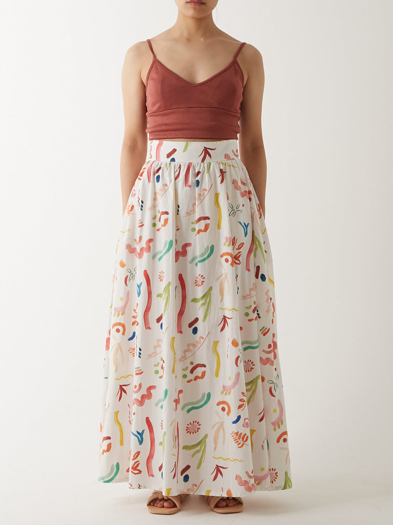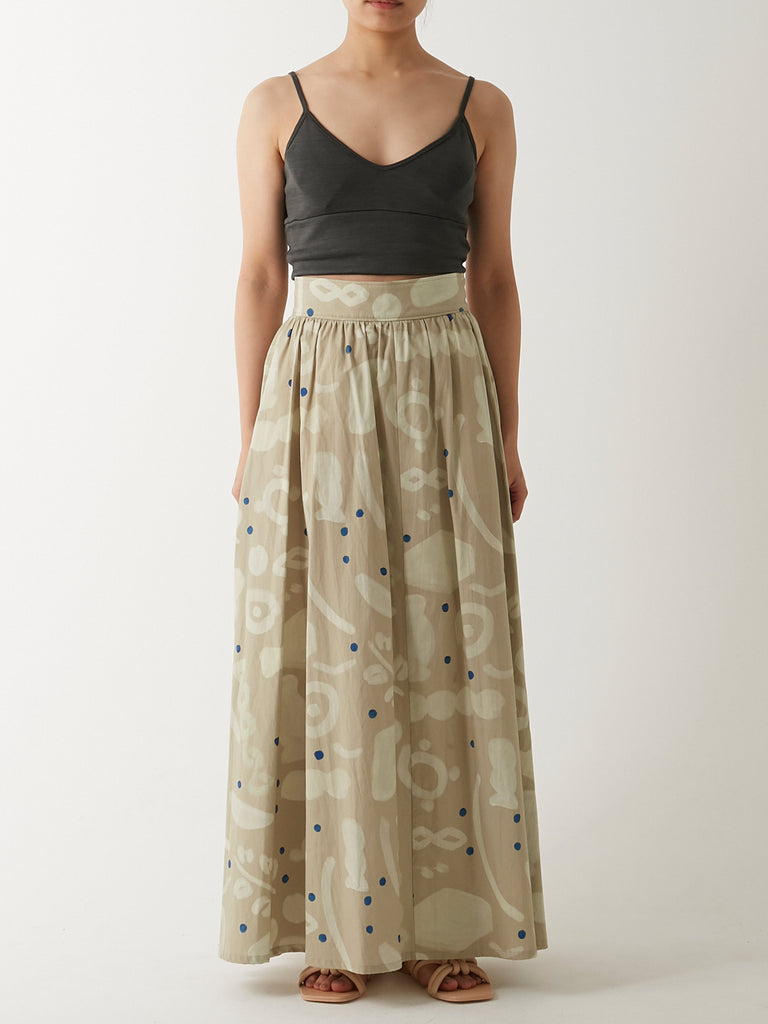 ウエストから裾にかけて美しくフレアに広がるマキシ丈のスカート。同じプリントのパラダイストップとセットアップで、またオーガニックコットンワッフル カップ付ショートタンクトップやウォッシャブル・シルクジャージー カップ付スムースブラトップといったショート丈のトップスと合わせるのもおすすめです。