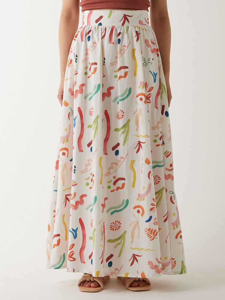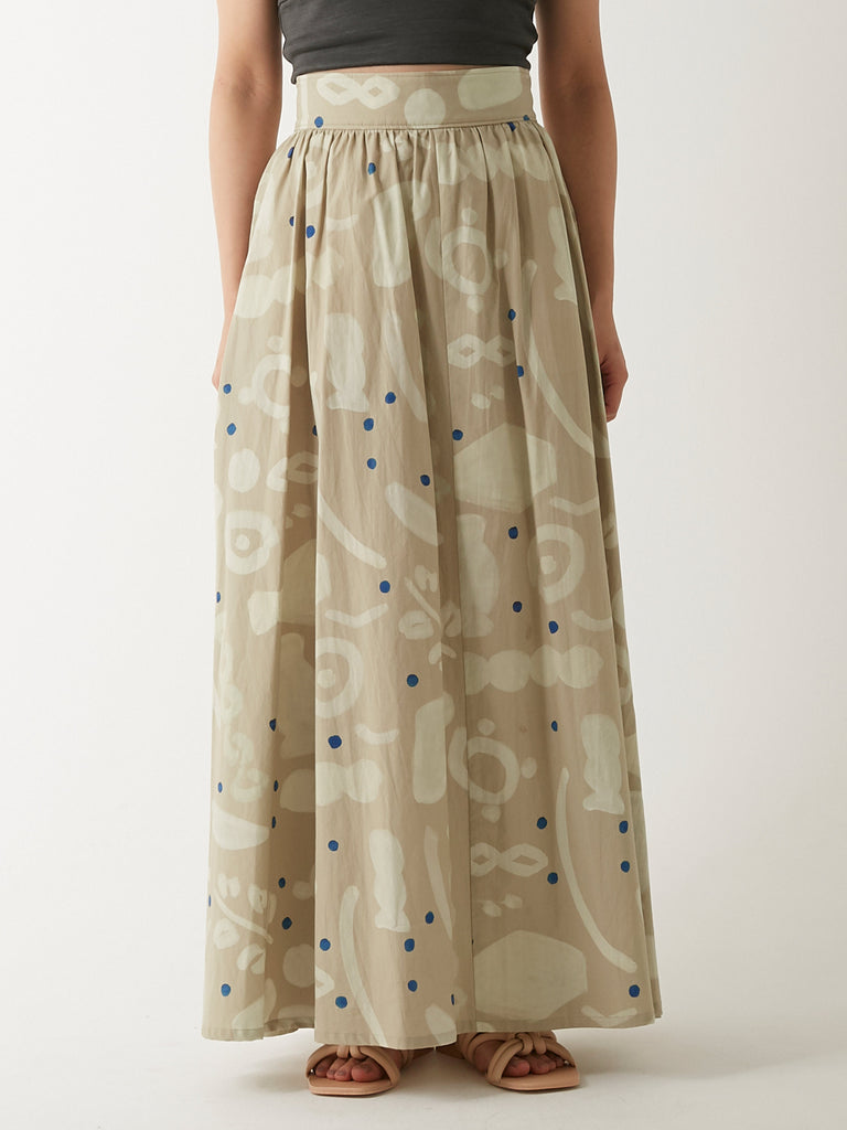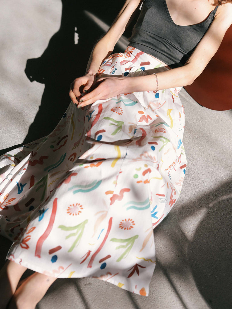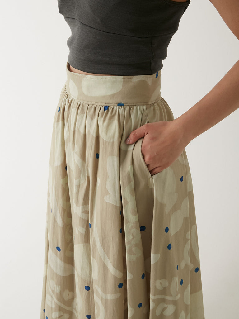 ウエストから裾にかけて美しくフレアに広がるマキシ丈のスカート。同じプリントのパラダイストップとセットアップで、またオーガニックコットンワッフル カップ付ショートタンクトップやウォッシャブル・シルクジャージー カップ付スムースブラトップといったショート丈のトップスと合わせるのもおすすめです。